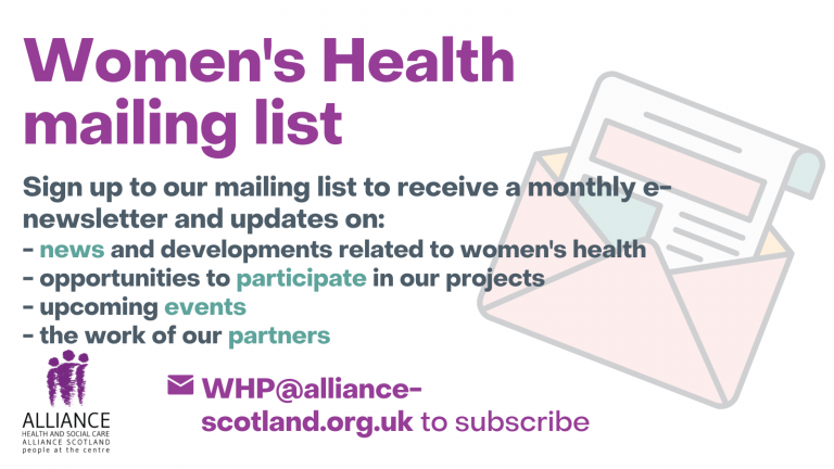 The ALLIANCE has been contributing to progressing women’s access to health information and services throughout its history as a third sector champion of lived experience. We were previously involved in the development of the Scottish Government’s Women’s Health Plan (this link will take you away from our website), and are now supporting in its implementation through a dedicated programme of work.